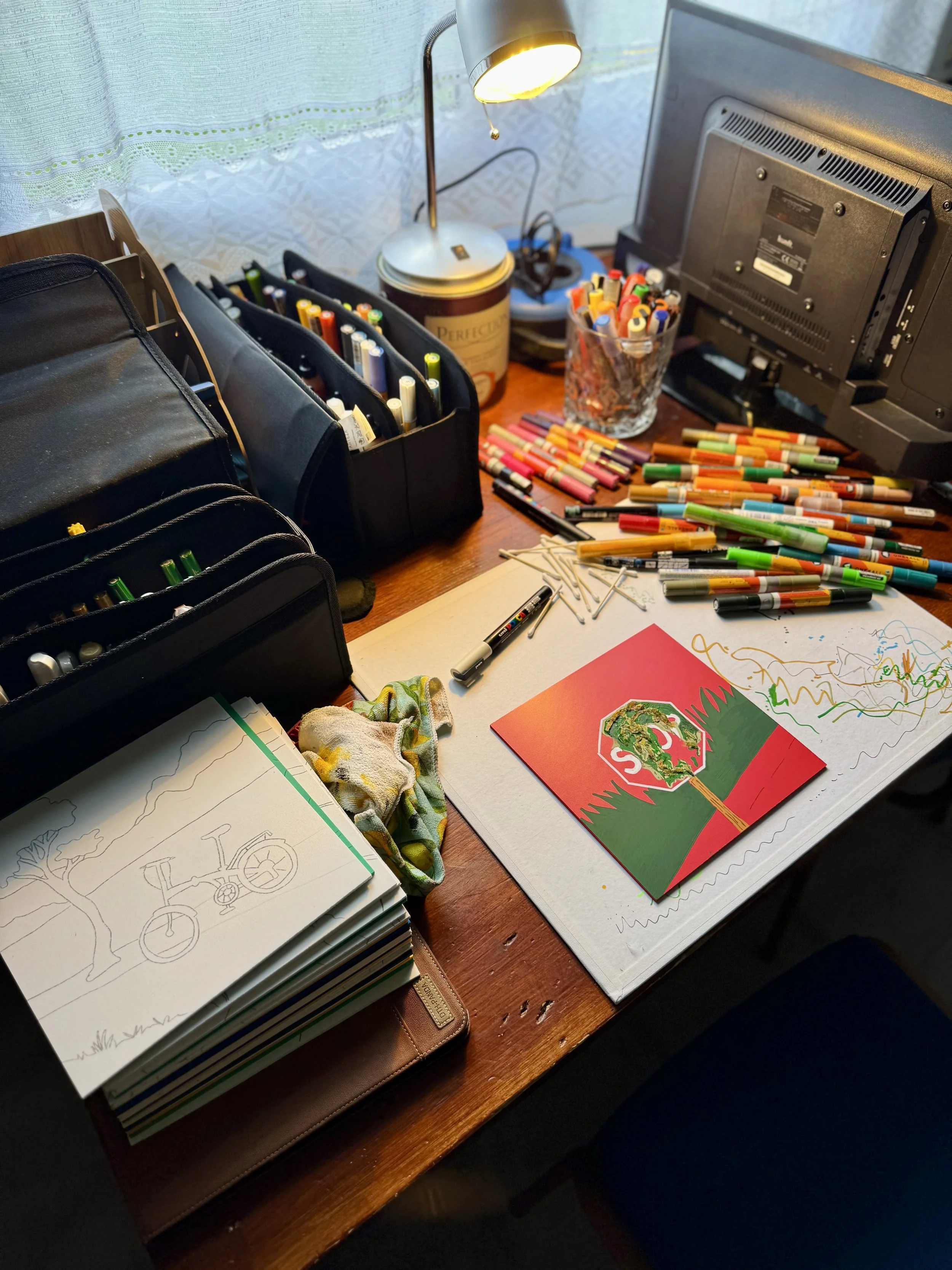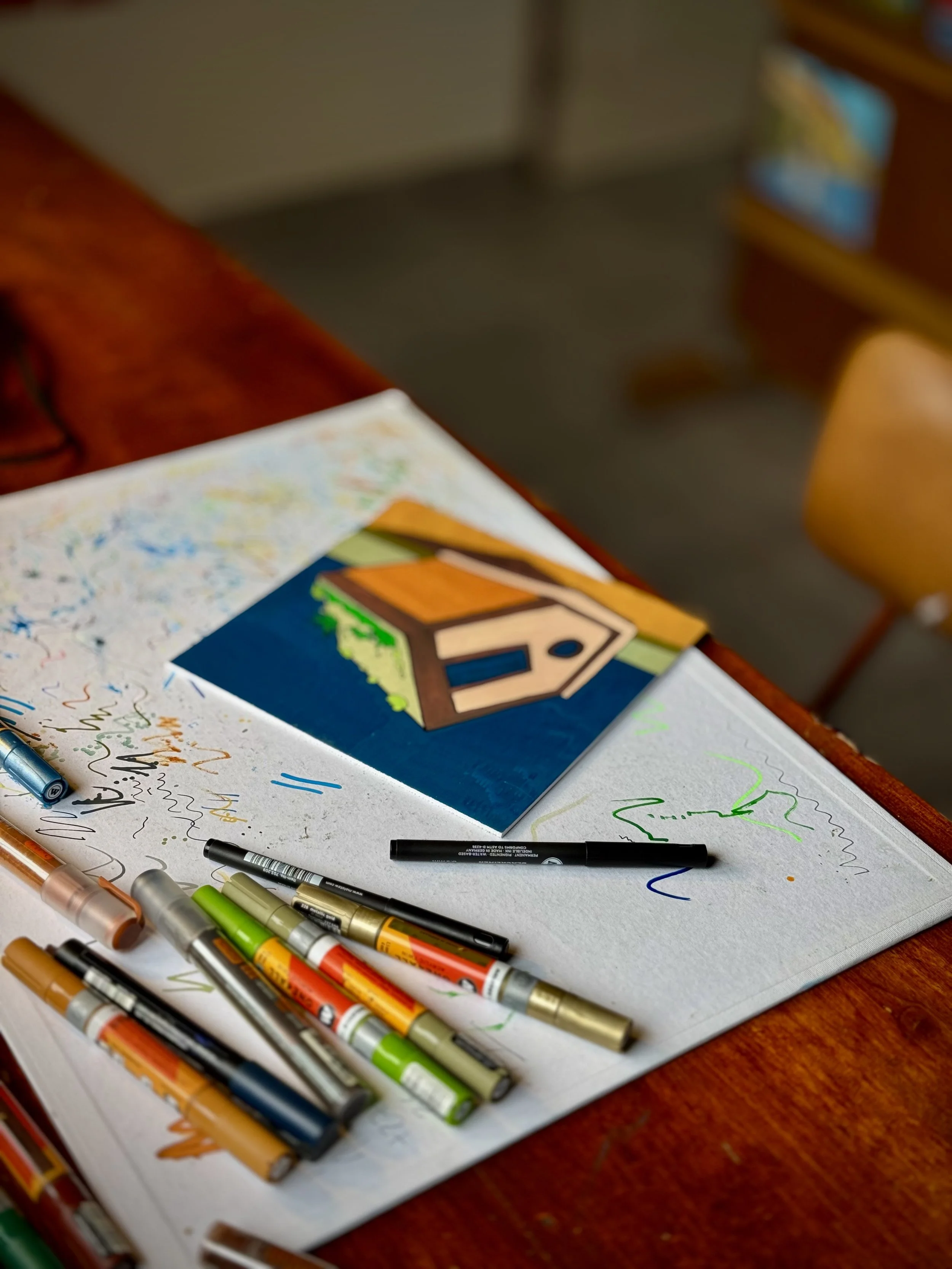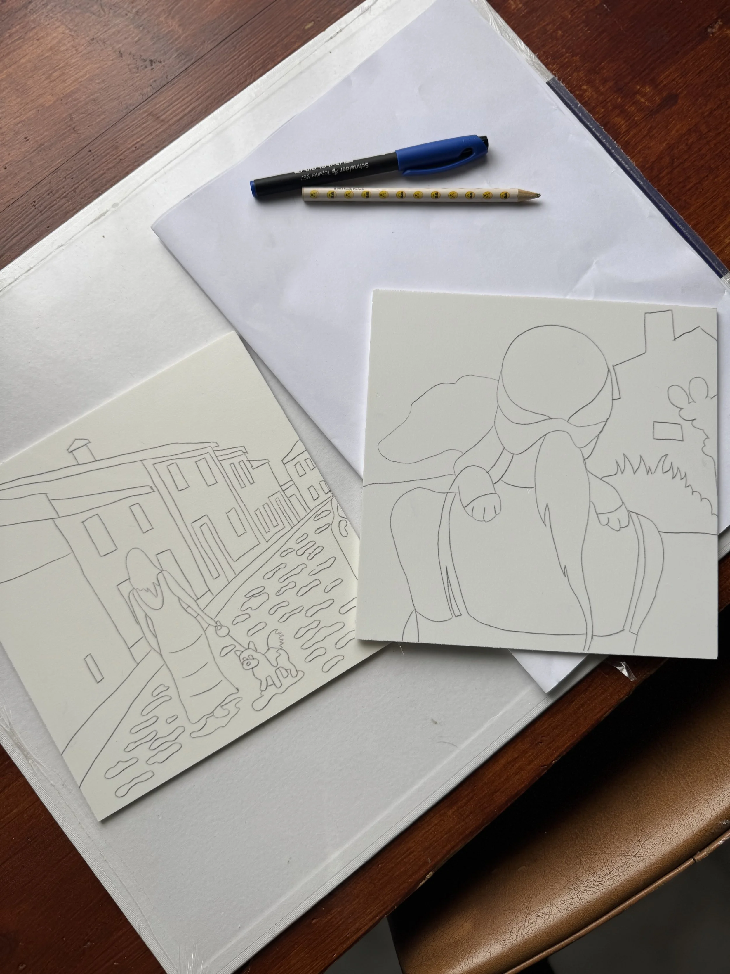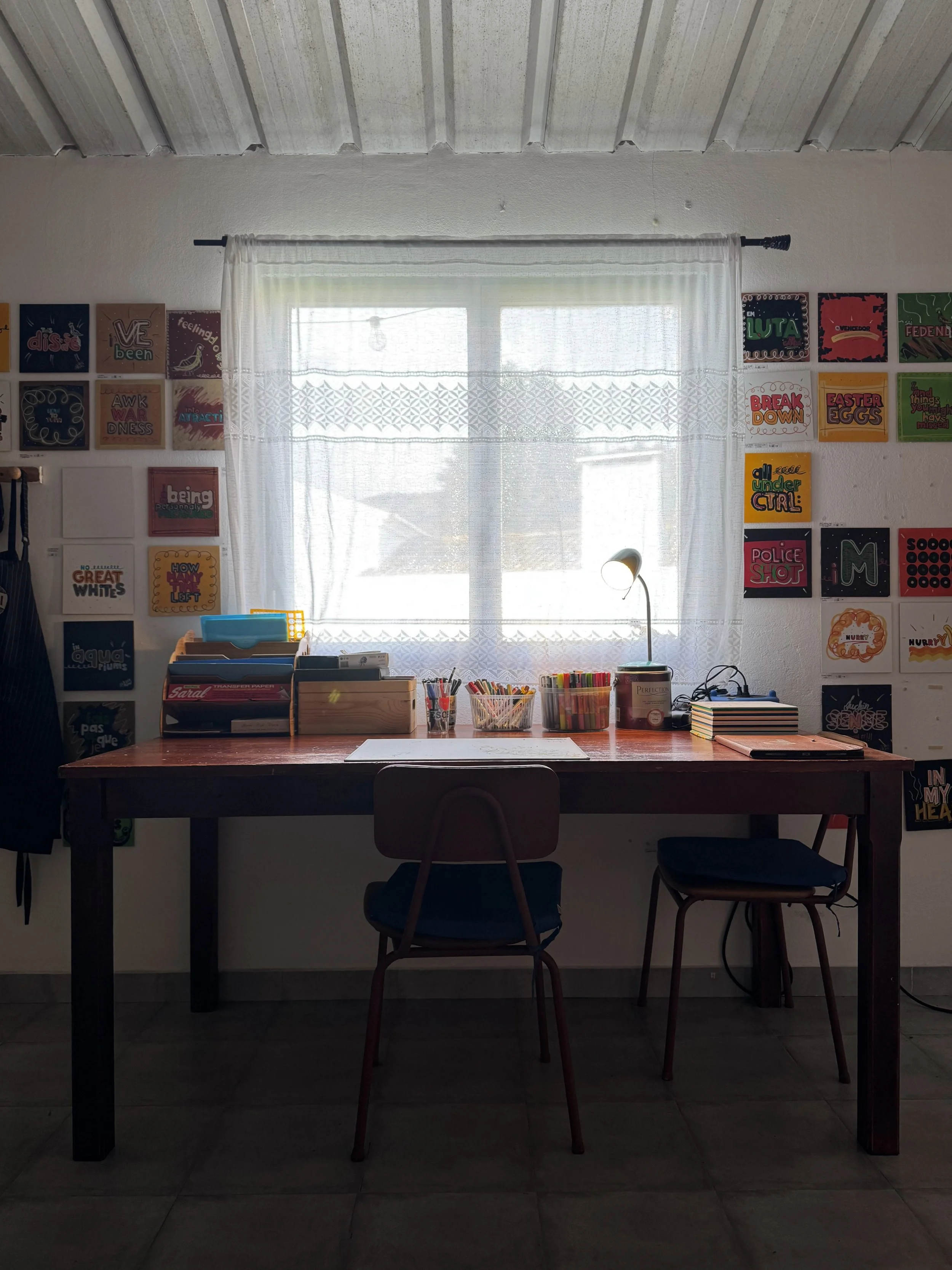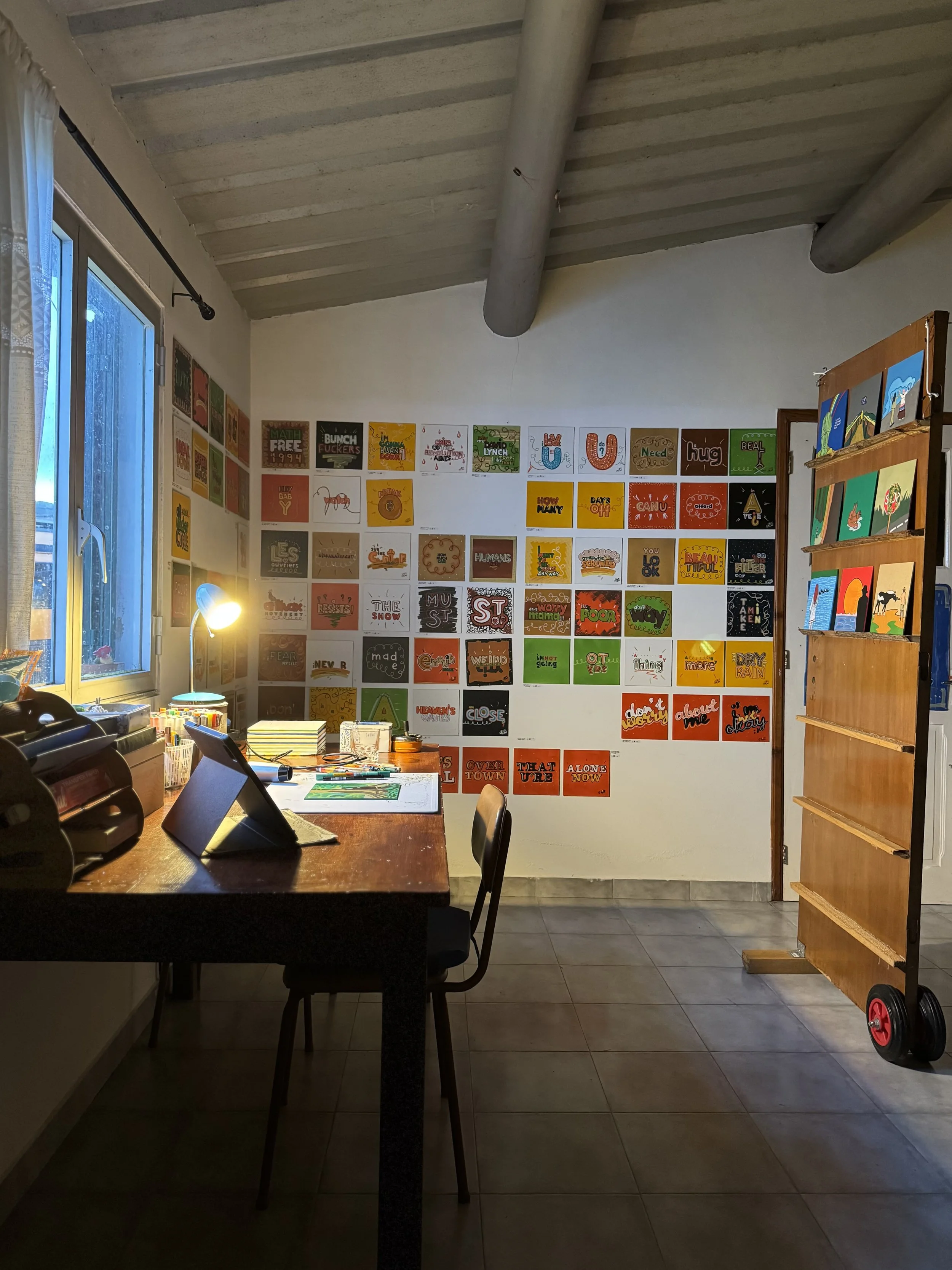 This is where I spend most of my rainy and foggy days: drawing, painting, testing colors, letting things unfold at their own rhythm. The studio holds the silence I need, the light I trust, and the kind of daily mess that only happens when a space is truly lived in. Everything here has a purpose, even if it’s just to remind me why I keep creating.
