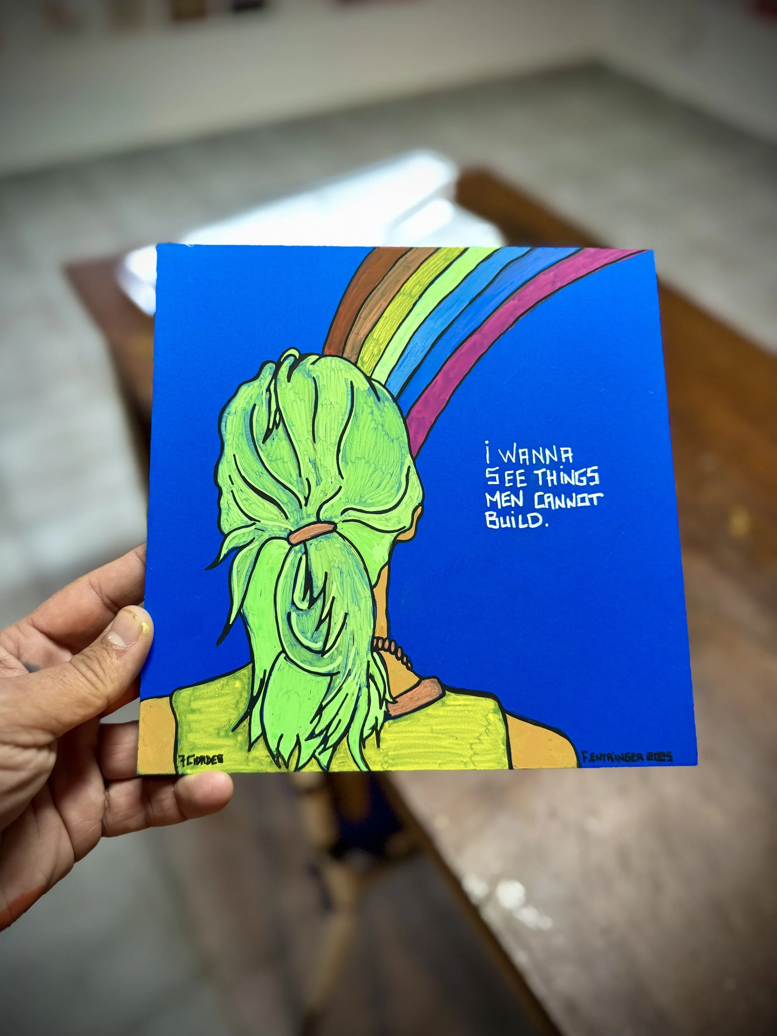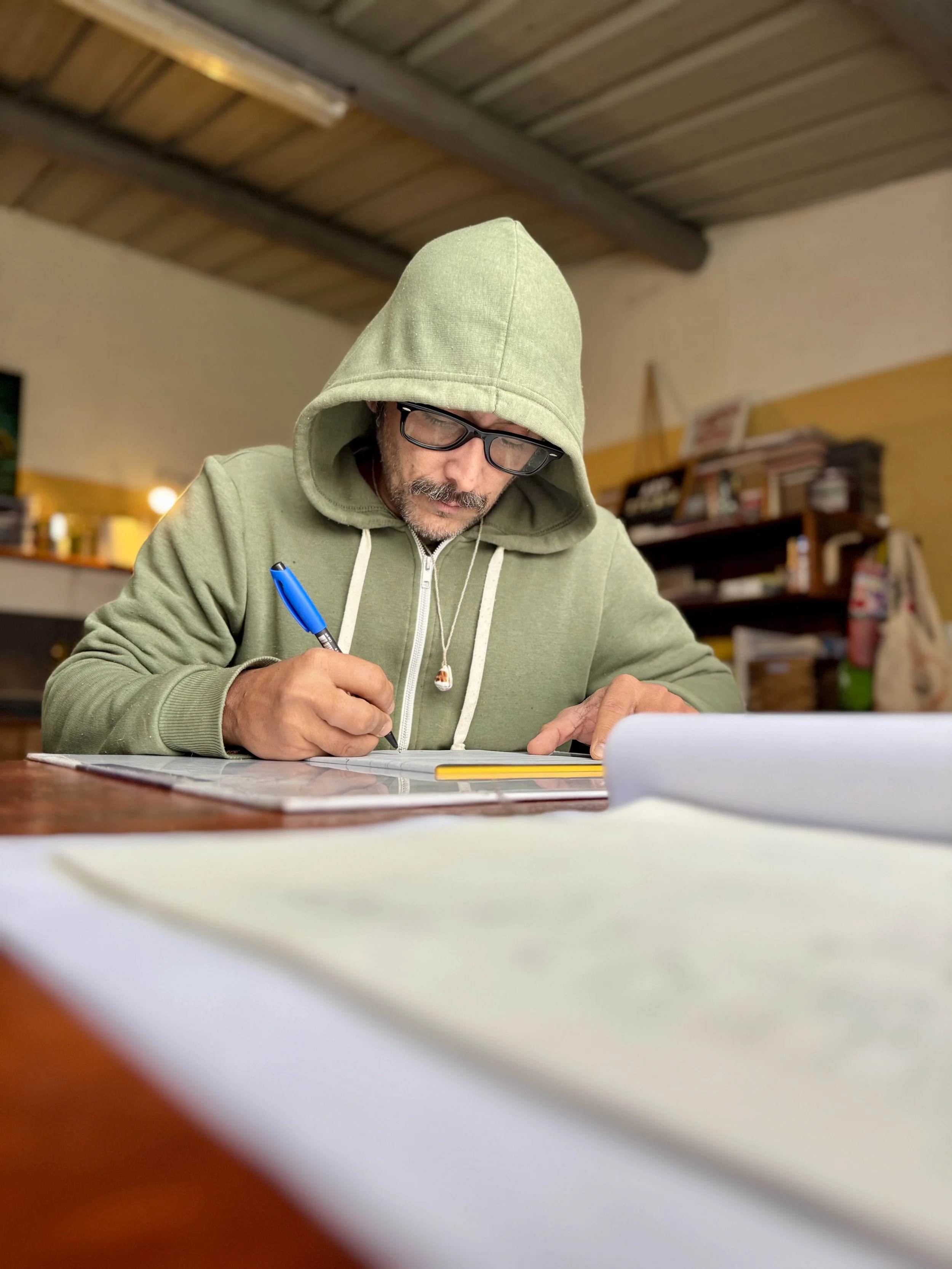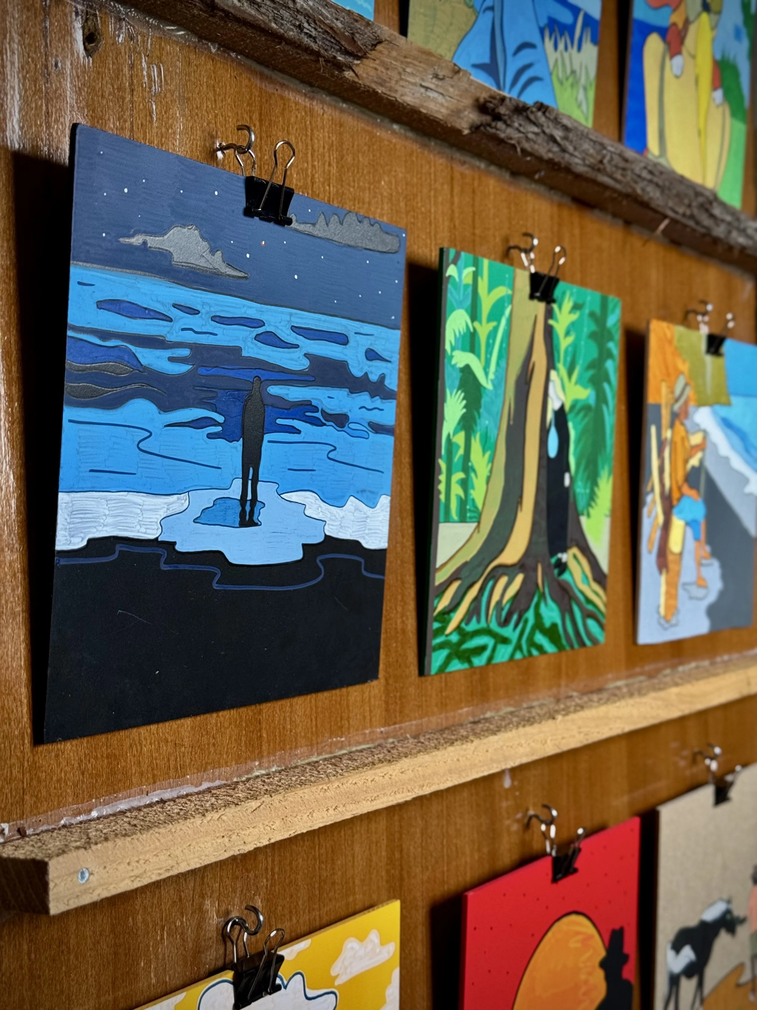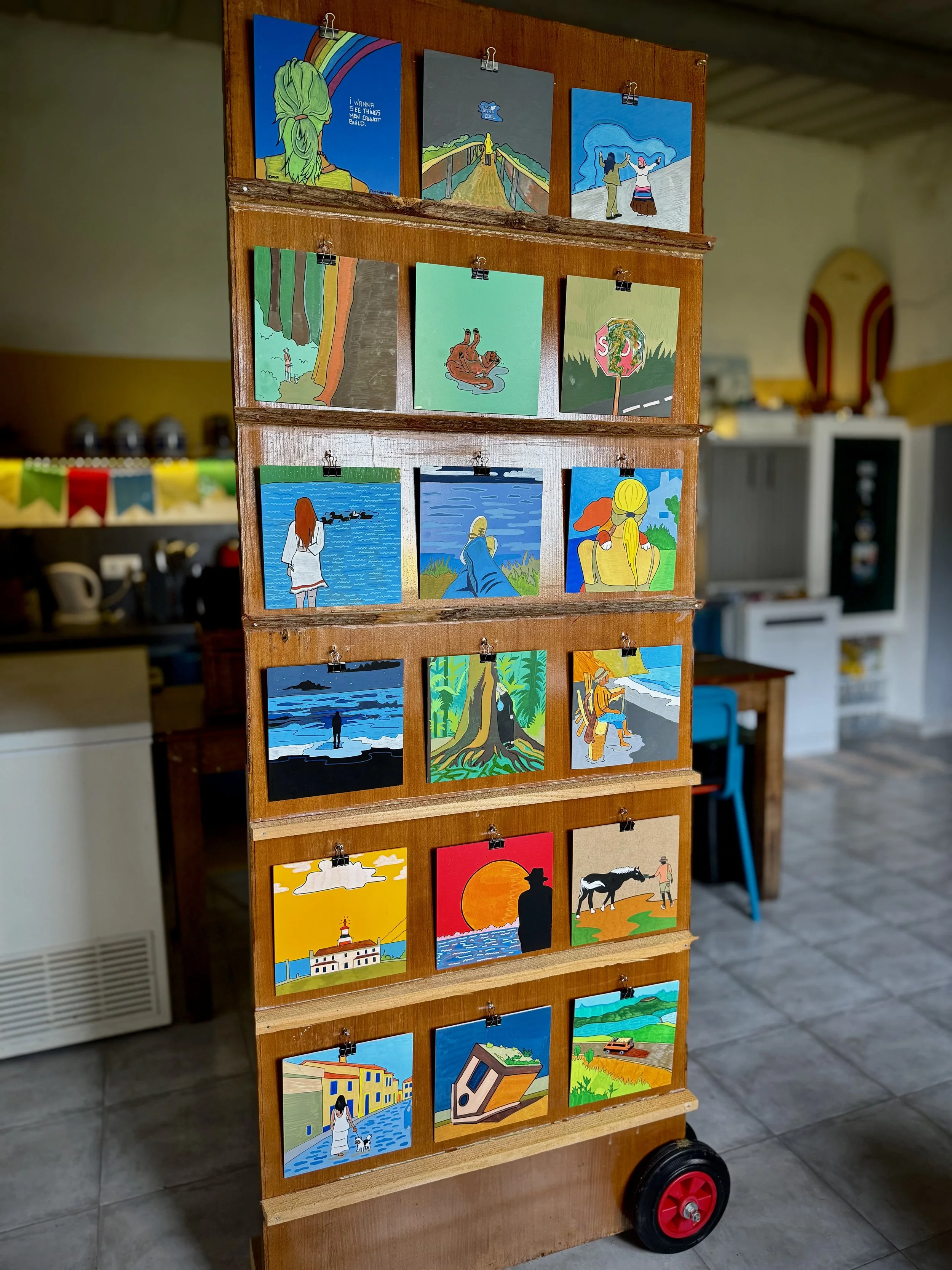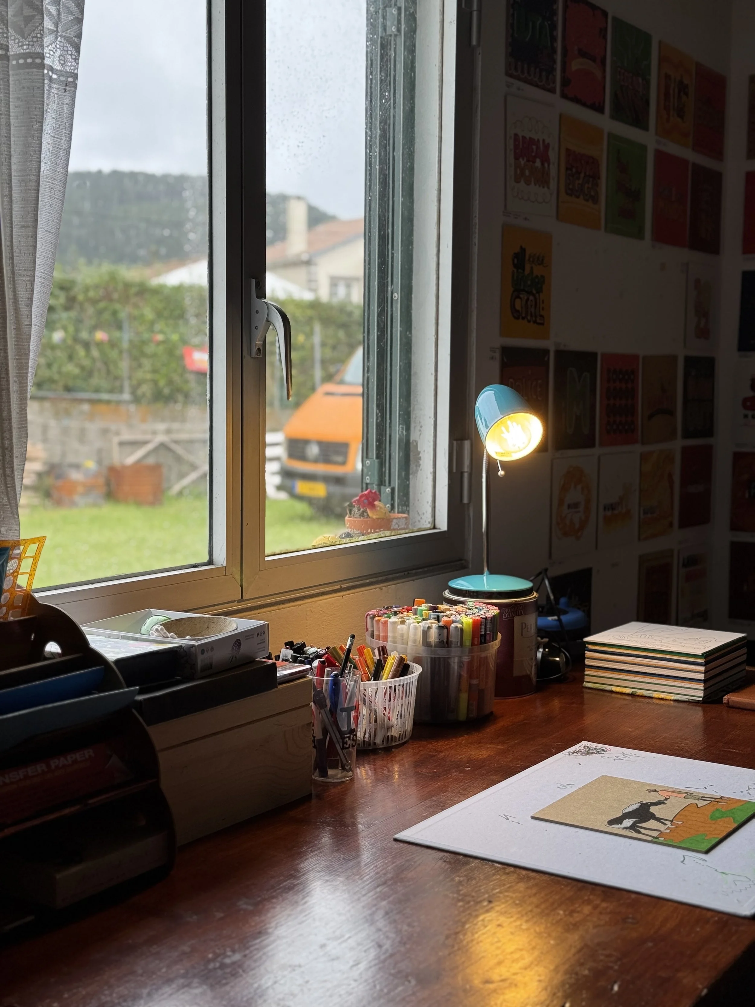 “Inside this small room in Sete Cidades, I built the place where my ideas finally learn to breathe. It’s nothing complicated — just a big wooden table worn by years of use, a window that gathers every mood of the crater, and walls filled with dozens of small paintings that have grown with me, square by square.