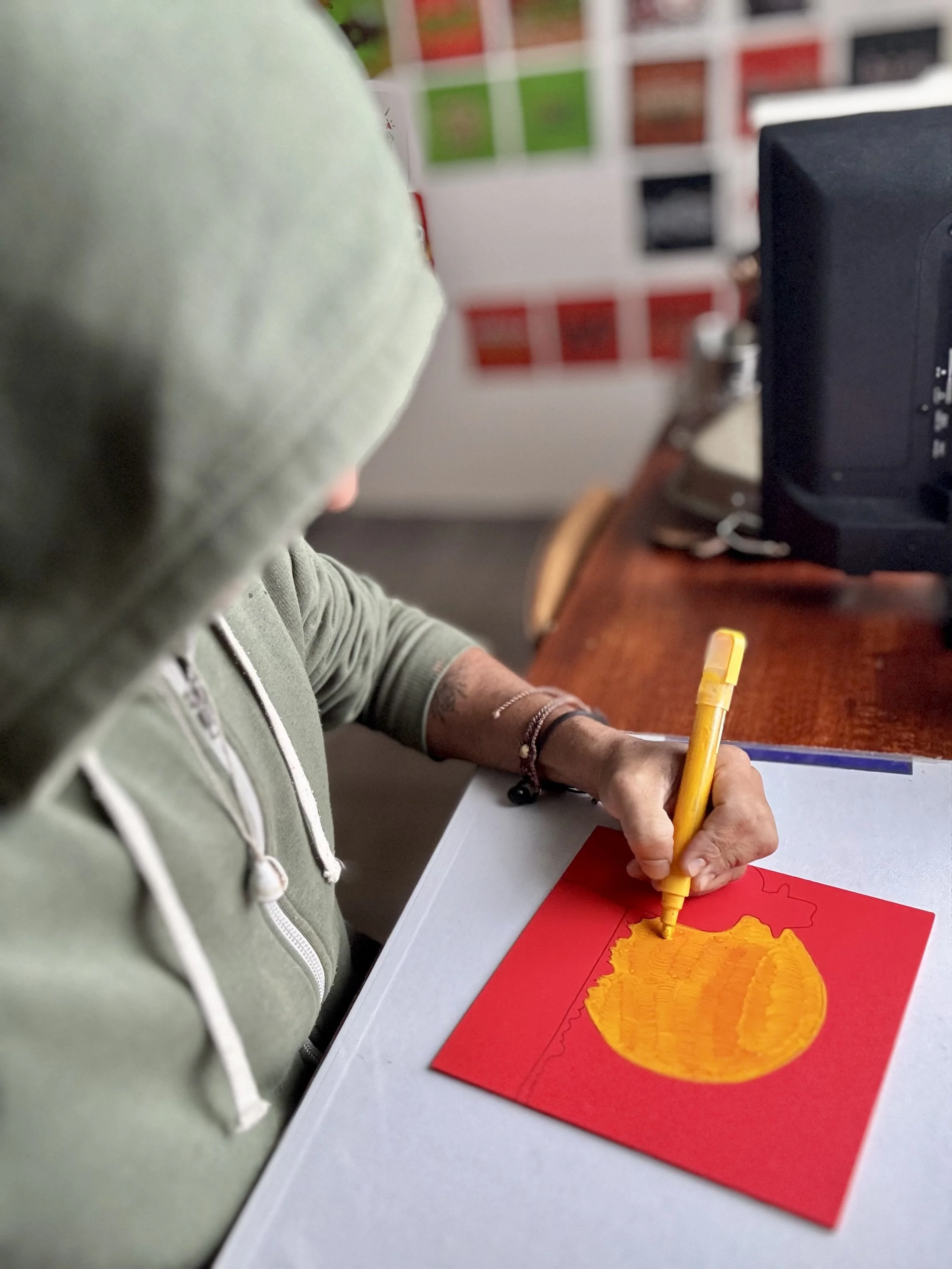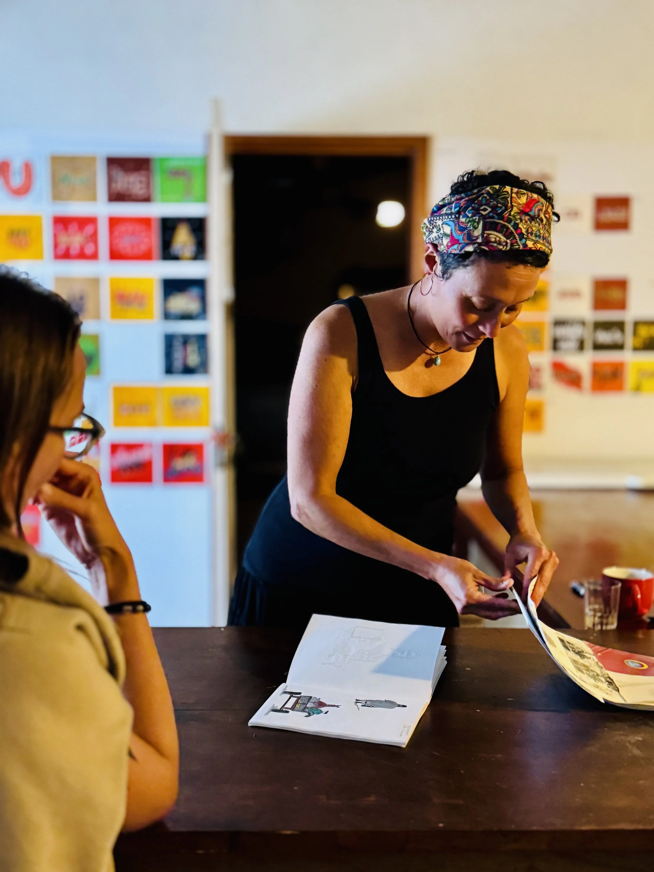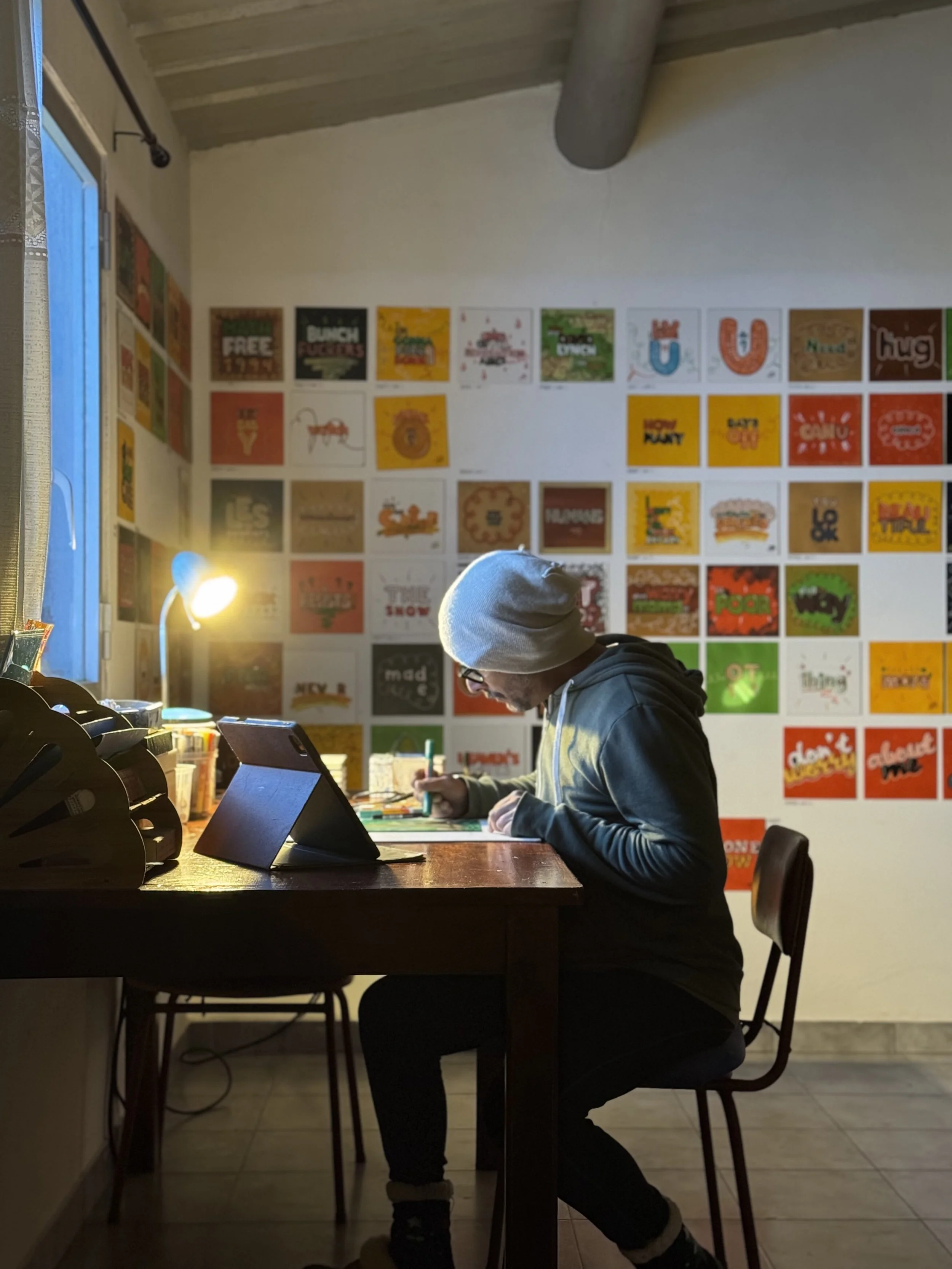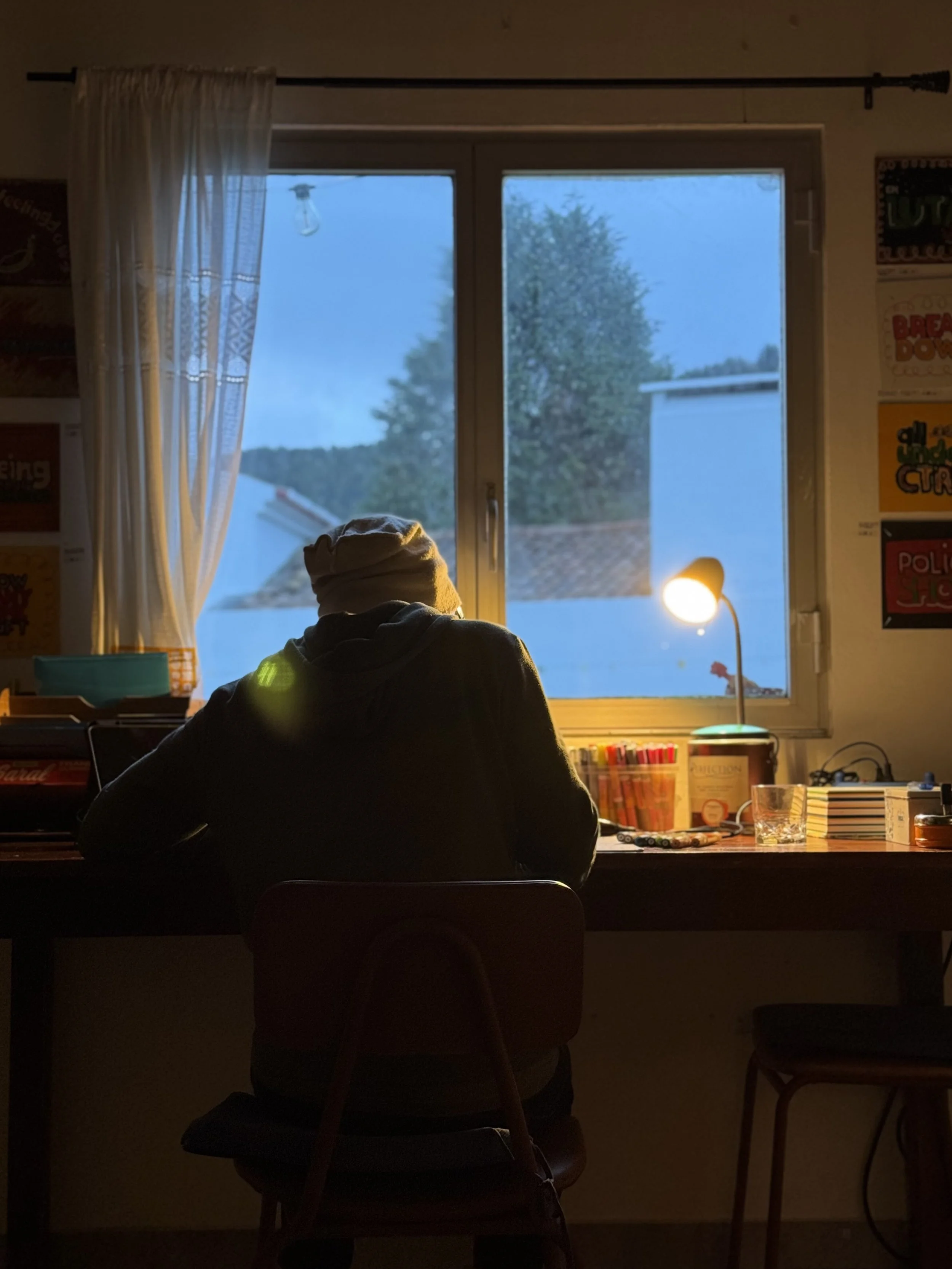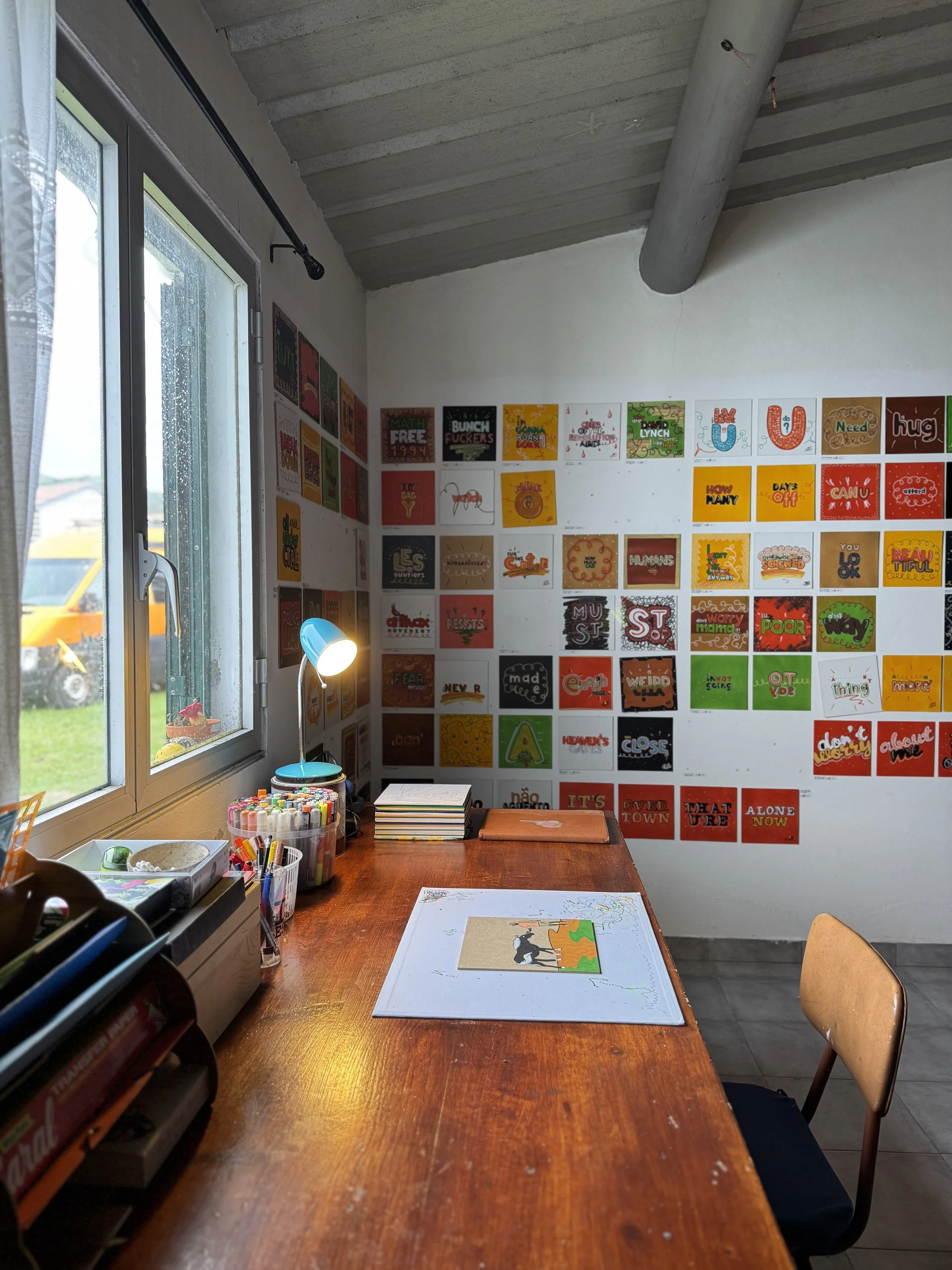 I share this space with the artists who join the AstroVan Residency. We eventually work side by side, listening to the rain on the window or to the village quietly moving outside. The studio isn’t staged or polished — it’s real, in constant use, and open enough for each resident to find their own corner inside it.